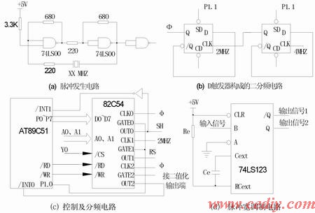 控制电路主要由单片机AT89C51及逻辑门电路组成。AT89C51最高工作频率达24MHz,内含4KB的Flash存储器。用于82C54的初始化、控制计数脉冲的通断、计数器的启动、停止及完成系统中其它任务。